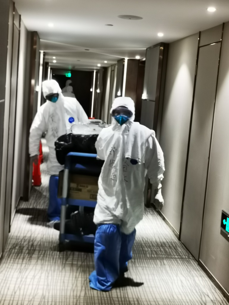 人在防护服里面特别闷热而且行动不便,才做了两间房间,大家就已经大汗淋漓,护目镜也起了雾视线不清。但服务人员顾不上眼前的困难,大家齐心协力一个半小时就将36间房间打扫出来,迎接第二批的隔离人员。当服务人员走出隔离污染区脱下防护服时,身上的衣服已经被汗水浸透,脸上被口罩和护目镜勒出了一道道印痕,虽然口上说“像水里捞出来一样,感觉好像耳朵都要被勒掉了”,但脸上却洋溢着欢快的笑容,互相打趣拍照说要留下上一线的纪念照片给家人看。