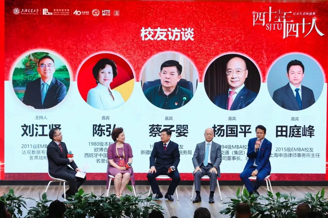 6月15日,由交大安泰校友会出品的纪念管理学院恢复建院四十周年献礼《四十年四十人》纪录片正式展映。该片讲述了从1984年上海交通大学原管理学院(现安泰经济与管理学院)恢复建院四十年以来,来自不同背景、不同经历、不同行业的四十位校友心怀梦想、逐浪前行、知行合一、踔厉奋发,追求自我价值实现的故事。杨国平董事长作为杰出校友代表在影片中动情讲诉自己的追梦历程。观影后,杨国平董事长还与1980级本科校友欧博合CEO、西班牙中国会创始人名誉会长陈弘,1984级本科校友、新疆维吾尔自治区税务局一级巡视员蔡子婴,2011级EMBA校友、达观数据有限公司首席战略官刘江贤,2015级EMBA校友、上海申浩律师事务所主任田庭峰,各自分享了影片背后的故事。